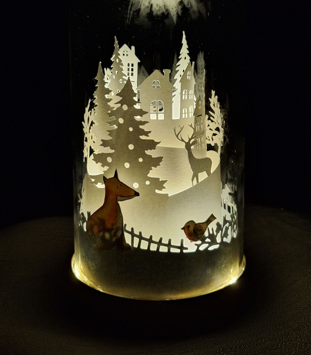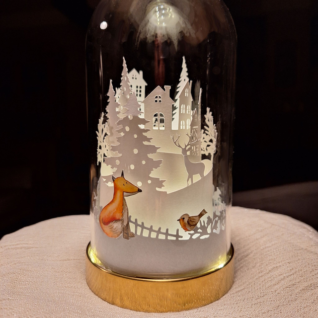 Paesaggio invernale, con diversi livelli di sfondo intagliati su cartoncino colorato, in primo piano due piccoli acquerelli sagomati che raffigurano una volpe e un pettirosso. Una campana di vetro con base color oro ricopre e protegge il tutto. All'interno c'è anche una catena di lucine Led (alimentate a batteria) che creano un'atmosfera suggestiva al buio. Le pile sono incluse.