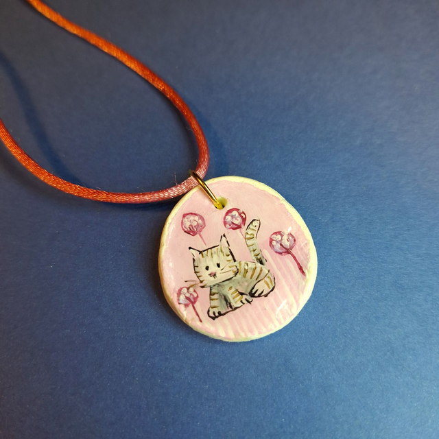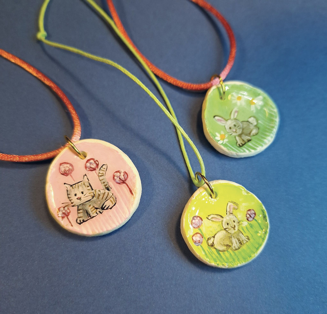 Collane interamente fatte a mano, in pasta autoindurente, dipinte a mano con colori a base acquosa e ricoperte in resina atossica. Sono completate da un cordino colorato con chiusura a nodo scorrevole. Le parti in metallo sono anallergiche in acciaio nichel free. Sono disponibili vari soggetti tutti dedicati agli animali.