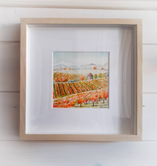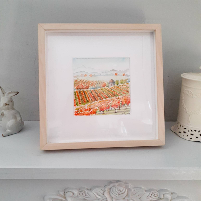 Le dimensioni del dipinto sono cm 12x12, è venduto con cornice di cm 25x25 in legno chiaro con passepartout bianco. Può essere appeso o appoggiato in quanto la cornice è dotata sia di gancetto che di supporto.